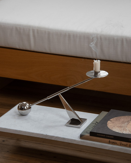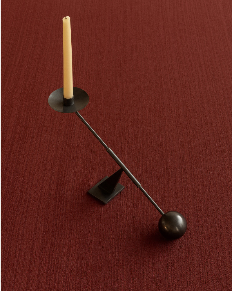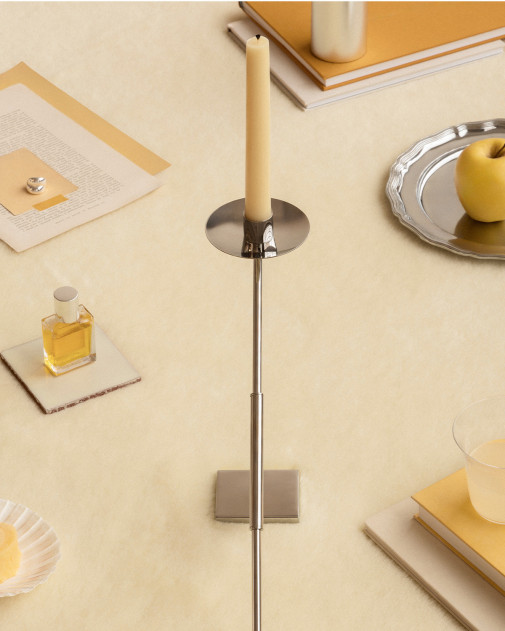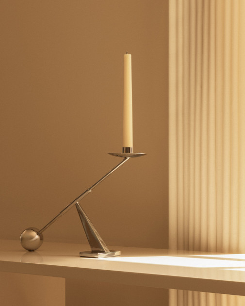 Świecznik dostępny jest w wykończeniach patynowanego mosiądzu, czarnej stali malowanej proszkowo oraz polerowanej stali. Każdy wariant nadaje projektowi nieco inny charakter – od eleganckiego połysku po bardziej graficzną, minimalistyczną estetykę.