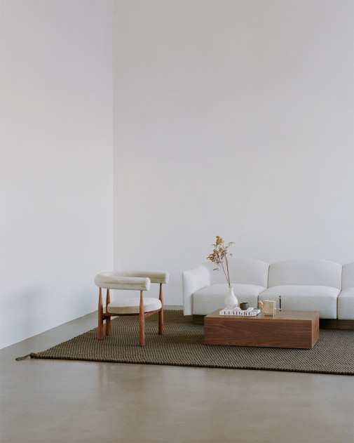 Zaprojektowany przez Lottę Agaton, opiera się na prostym, ale charakterystycznym geście – grube, plecione liny tworzą powierzchnię o wyraźnej, niemal rzeźbiarskiej fakturze. Całość dopełnia subtelny detal w postaci węzła umieszczonego w rogu, który nadaje projektowi swobodny, nieformalny charakter.