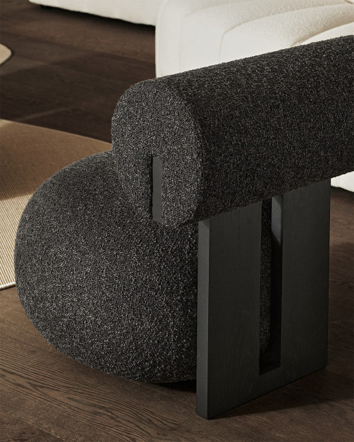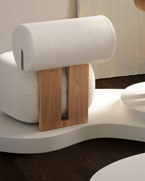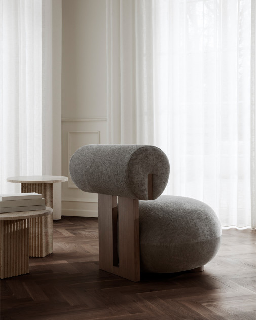 Fotel wyróżnia się kontrastującą sylwetką – miękkie siedzisko i oparcie zestawione zostały z masywną, rzeźbiarską ramą z litego dębu FSC®, która nadaje całości niemal architektoniczny wyraz. Charakterystyczne przeszycie pośrodku siedziska nie tylko podkreśla jego organiczną formę, ale także wzmacnia jego konstrukcję.