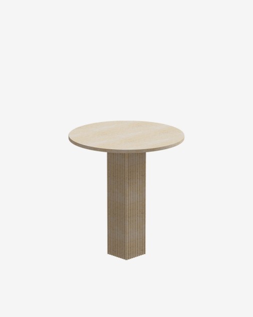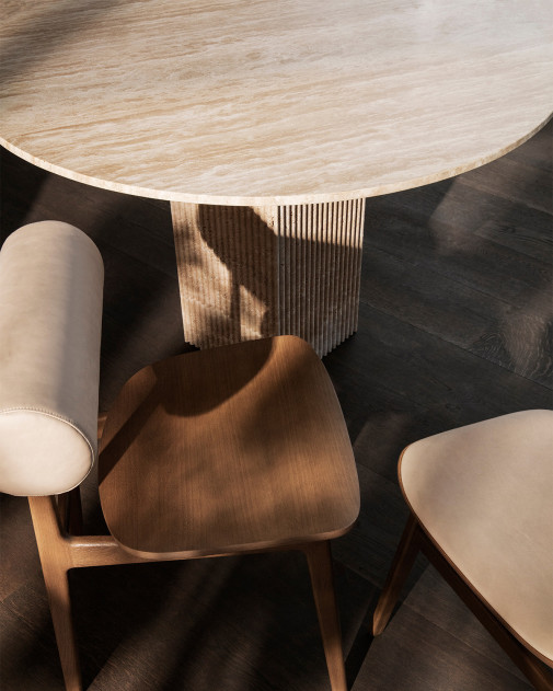To właśnie ten motyw stał się sercem projektu, przejawiającym się w postaci flutowanej kolumny będącej podstawą stołu. Stół wykonano z naturalnego trawertynu – kamienia o niepowtarzalnej strukturze i wyrazie.