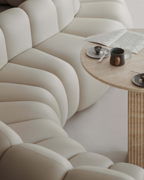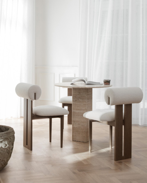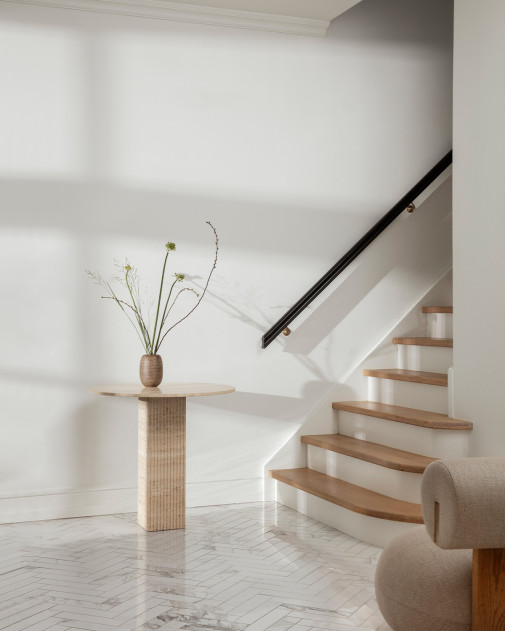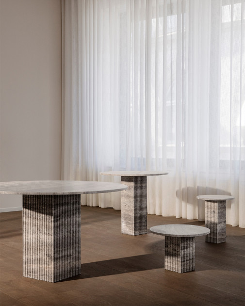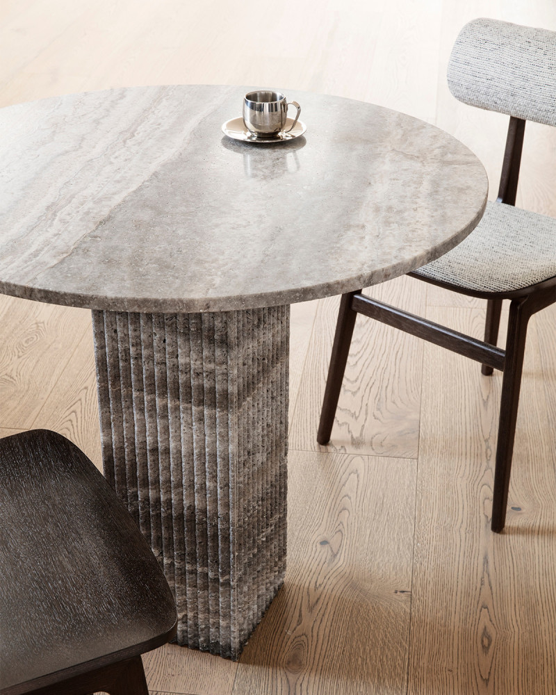 To właśnie ten motyw stał się sercem projektu, przejawiającym się w postaci flutowanej kolumny będącej podstawą stołu. Stół wykonano z naturalnego trawertynu – kamienia o niepowtarzalnej strukturze i wyrazie.