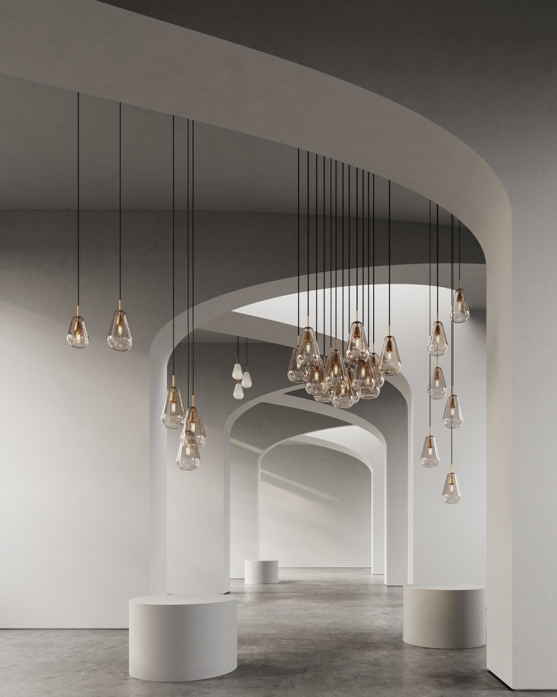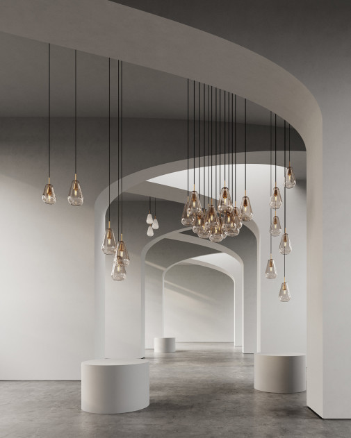 Anoli 6 to elegancki żyrandol inspirowany kroplami deszczu, który łączy ręcznie dmuchane, złociste klosze z detalami w kolorze nordyckiego złota. Sześć zwisających, organicznych form tworzy lekki, przestrzenny układ, doskonale komponujący się w przestronnych wnętrzach, takich jak hole, klatki schodowe i lofty. To nowoczesna interpretacja klasycznego żyrandola, wprowadzająca do wnętrza ciepło, harmonię i wyrafinowany styl.
