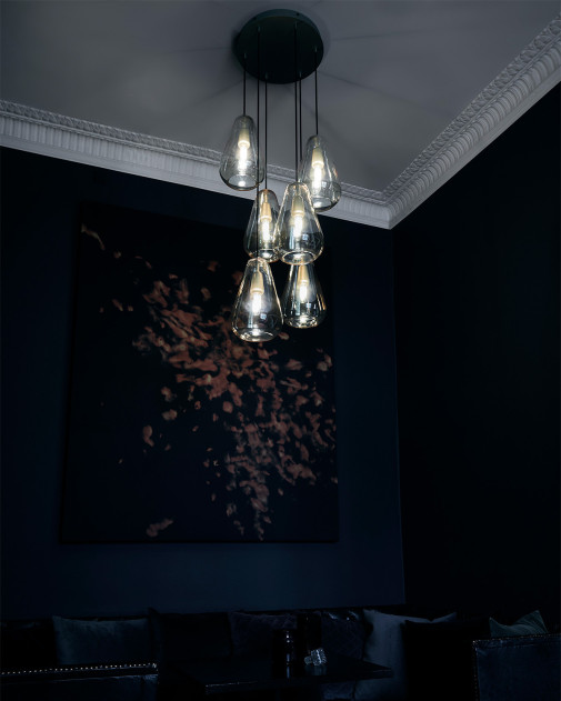 Anoli 6 to nowoczesny żyrandol, który odzwierciedla subtelną grę światła i wody, inspirowaną jesiennymi kroplami deszczu. Składa się z sześciu kloszy w kształcie łzy, wykonanych z ręcznie dmuchanego szkła, pokrytego delikatnym, złocistym odcieniem, który nadaje lampie ciepłą, przyjazną aurę.