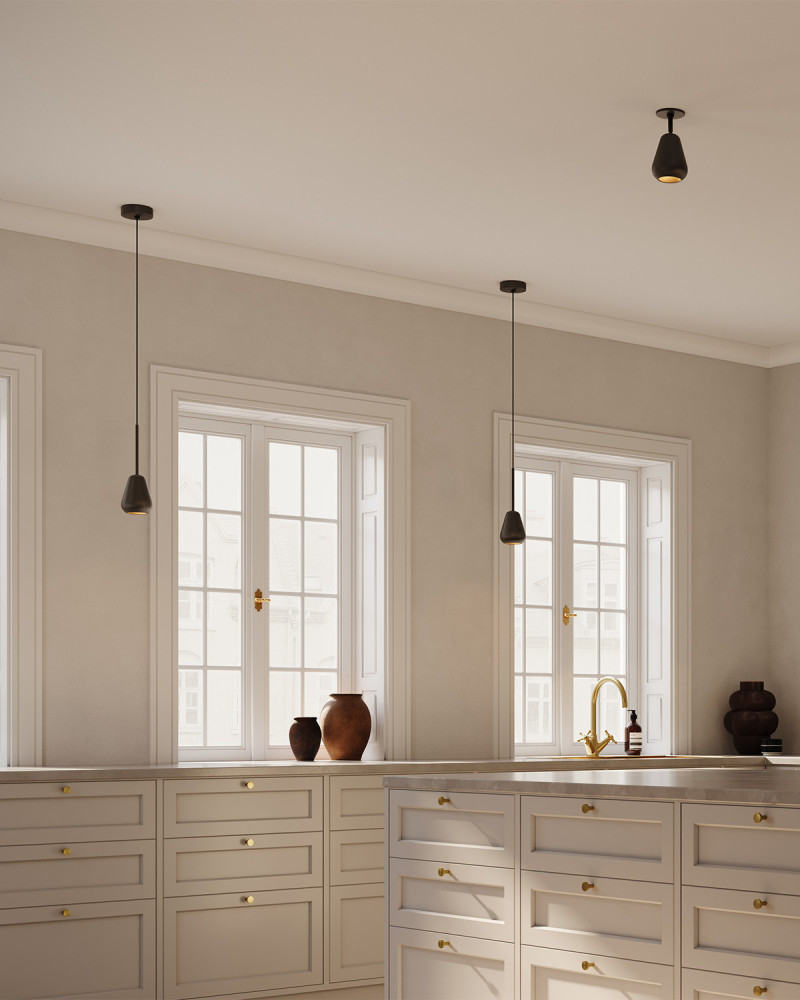Dzięki wysokiej mocy światła, Anoli Spot Pendant doskonale sprawdza się jako pojedyncza lampa nad kuchennym blatem, ale również w zestawieniu kilku punktowych lamp w rzędzie, tworząc spójne i funkcjonalne oświetlenie przestrzeni. Minimalistyczne czarne zawieszenie oraz materiałowy przewód podkreślają nowoczesny, industrialny charakter, a kompaktowa forma lampy sprawia, że pasuje ona do różnych stylów wnętrz, od skandynawskich po loftowe.