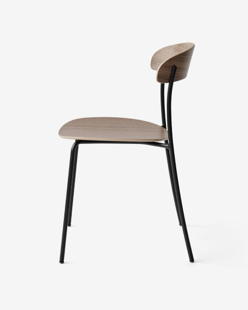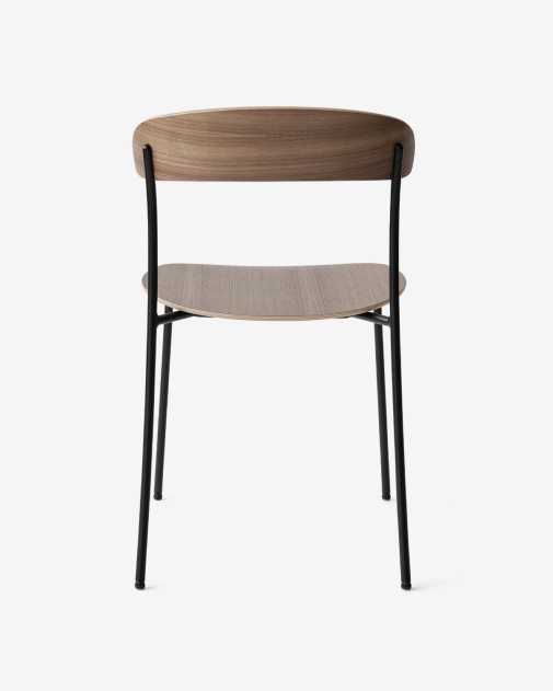 Rama ze stali malowanej proszkowo z siedziskiem i oparciem z formowanego forniru. Siedzisko i oparcie dostępne są w różnych okleinach drewnianych i/lub z tapicerką.