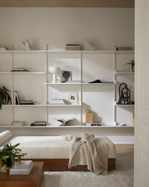New Works Wardrobe Shelf to część systemu półek zaprojektowanego z myślą o subtelnych detalach i inteligentnej elastyczności. Ten prosty, ale wyrafinowany regał został stworzony, aby harmonijnie wkomponować się w różnorodne wnętrza, kontynuując misję New Works polegającą na tworzeniu podwyższonych podstawowych elementów wyposażenia. Każdy aspekt został starannie przemyślany – od kanciastych profili wsporników ściennych po zintegrowane podpórki na książki, które utrzymują Twoje przedmioty na miejscu. Półki są starannie montowane za pomocą płaskich, radełkowanych śrub ze stali nierdzewnej, dodając uczciwego, ale wyrafinowanego detalu do projektu. System jest zaprojektowany tak, aby rozwijał się wraz z Twoimi potrzebami, oferując różnorodne rozwiązania do przechowywania.