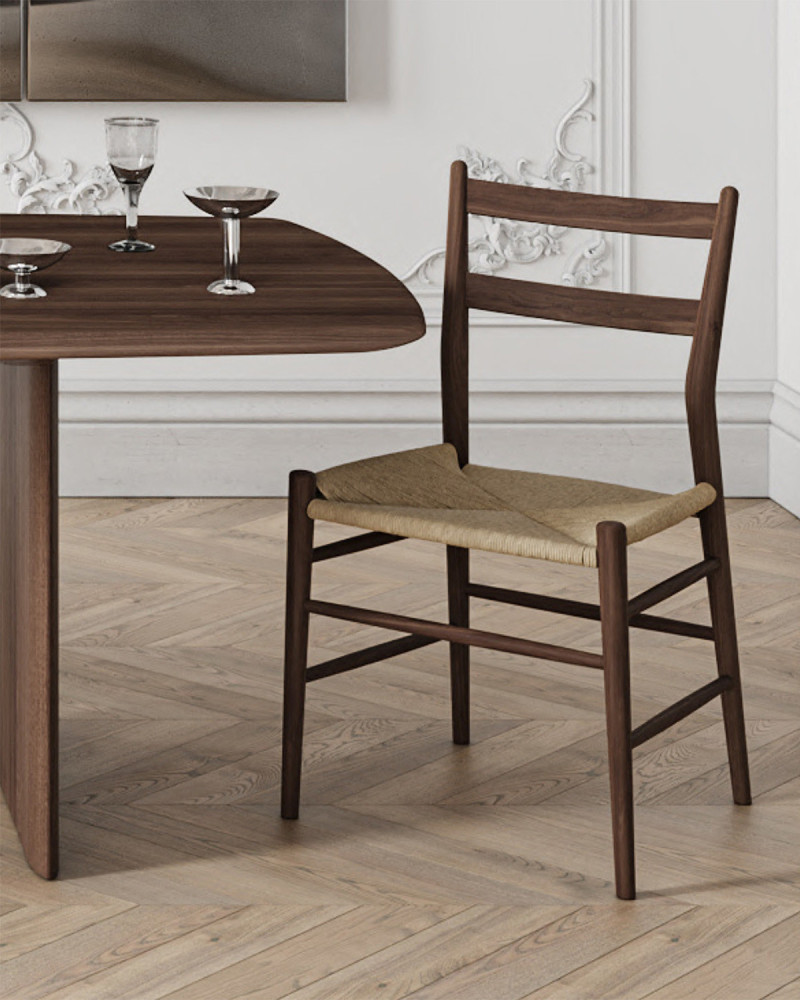 Siedzisko krzesła wykonane jest z ręcznie plecionego paper cord, dostępnego w naturalnym lub czarnym kolorze. Ten tradycyjny materiał nadaje projektowi wyjątkową teksturę i ciepły, naturalny charakter.