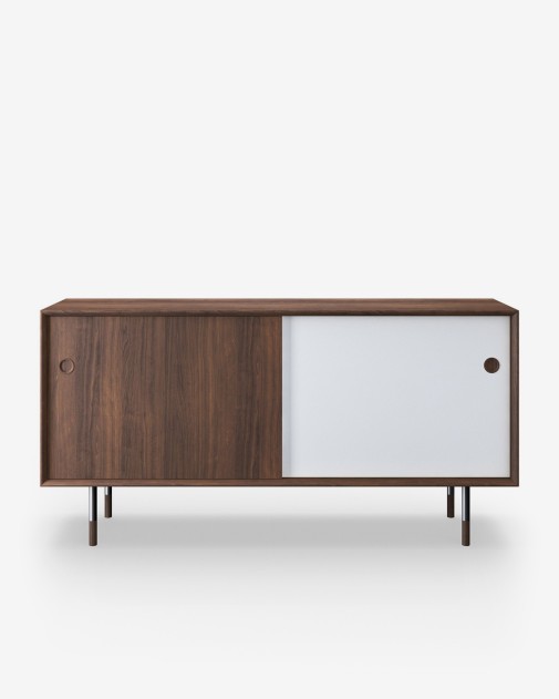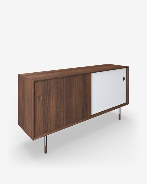 Sibast No 11 Sideboard to przykład prawdziwej ikony złotej ery duńskiego designu, zaprojektowanej w 1957 roku przez Arne Voddera, jednego z najwybitniejszych architektów i projektantów mebli swoich czasów. Komoda była pierwotnie częścią kolekcji, która zdobyła pierwszą nagrodę na Triennale di Milano i szybko zyskała uznanie na całym świecie – trafiając m.in. do Białego Domu, Watykanu i siedziby ONZ. Dzięki bliskiej współpracy między rodziną Voddera a Sibast Furniture, oryginalnym producentem, projekt ten został na nowo wprowadzony do kolekcji jako hołd dla dziedzictwa i wieloletniej przyjaźni Voddera z Helge Sibastem. Komoda wykonana jest z litego drewna i forniru dębowego lub orzechowego. Najbardziej charakterystycznym detalem są dwustronne, obrotowe drzwiczki – z jednej strony wykończone fornirem, z drugiej w kolorze (do wyboru: biały, żółty, niebieski lub czarny). Całość osadzona na smukłych drewnianych lub stalowych nogach, co nadaje meblowi lekkości i elegancji.