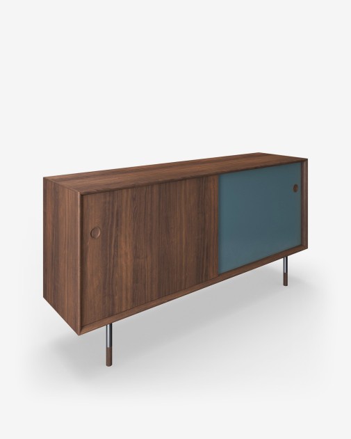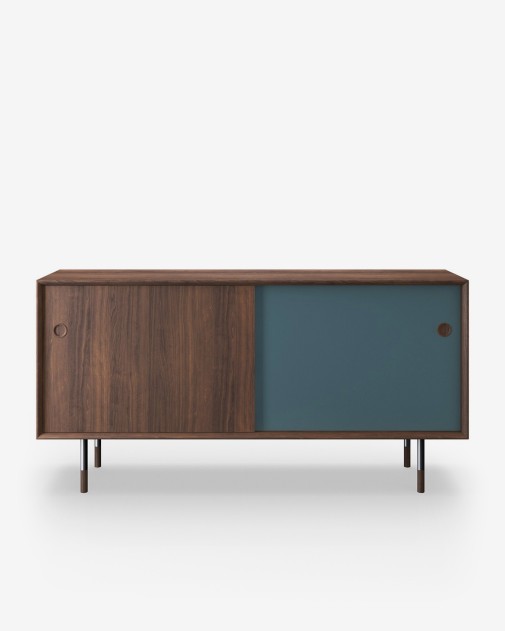Sibast No 11 Sideboard to przykład prawdziwej ikony złotej ery duńskiego designu, zaprojektowanej w 1957 roku przez Arne Voddera, jednego z najwybitniejszych architektów i projektantów mebli swoich czasów. Komoda była pierwotnie częścią kolekcji, która zdobyła pierwszą nagrodę na Triennale di Milano i szybko zyskała uznanie na całym świecie – trafiając m.in. do Białego Domu, Watykanu i siedziby ONZ. Dzięki bliskiej współpracy między rodziną Voddera a Sibast Furniture, oryginalnym producentem, projekt ten został na nowo wprowadzony do kolekcji jako hołd dla dziedzictwa i wieloletniej przyjaźni Voddera z Helge Sibastem. Komoda wykonana jest z litego drewna i forniru dębowego lub orzechowego. Najbardziej charakterystycznym detalem są dwustronne, obrotowe drzwiczki – z jednej strony wykończone fornirem, z drugiej w kolorze (do wyboru: biały, żółty, niebieski lub czarny). Całość osadzona na smukłych drewnianych lub stalowych nogach, co nadaje meblowi lekkości i elegancji.