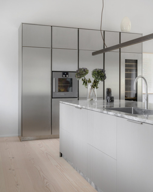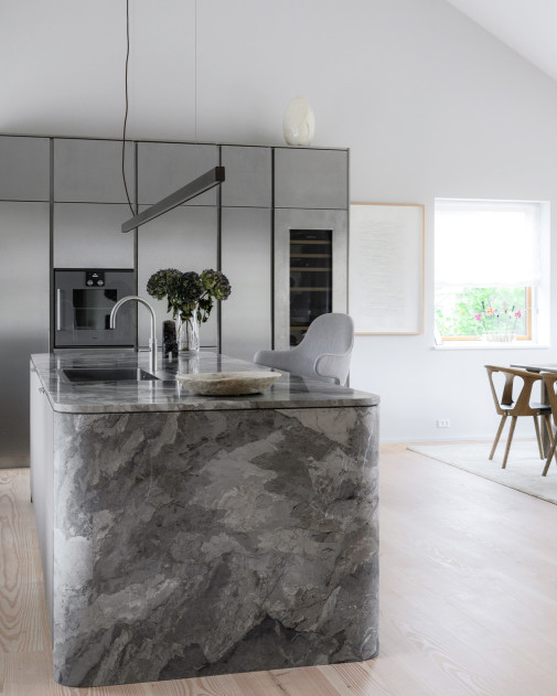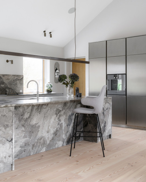 Forma została zredukowana do minimum: cienki, liniowy profil zawieszony na przewodach, bez zbędnych elementów. Dzięki temu lampa nie zakłóca widoku i nie dominuje przestrzeni – co ma kluczowe znaczenie nad wyspą kuchenną lub stołem.