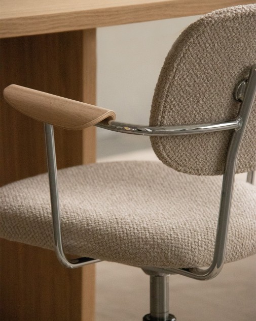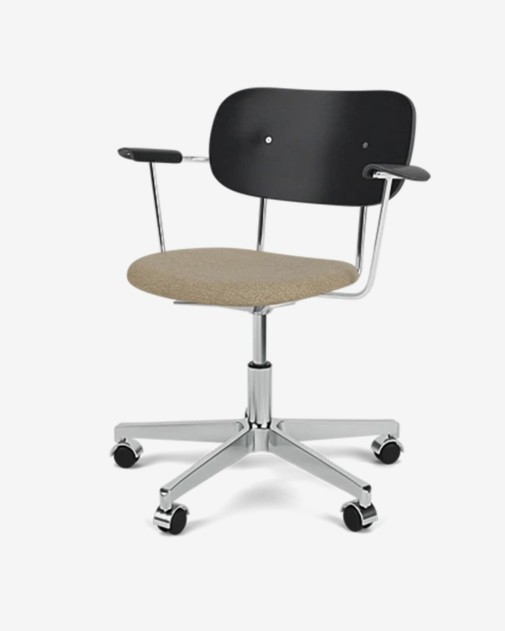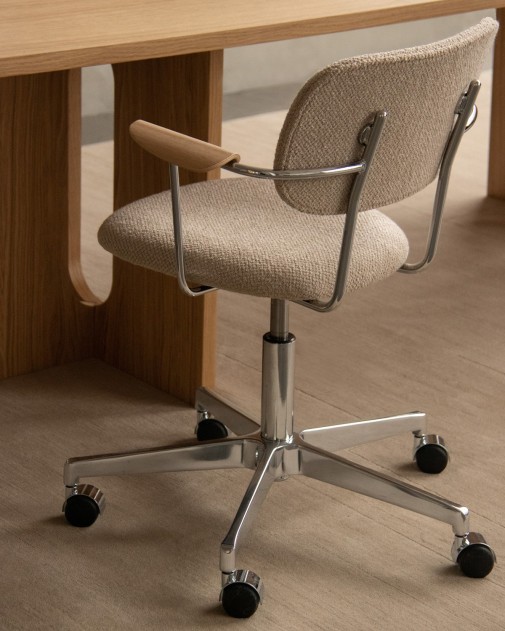 Co Task Chair z tapicerowanym siedziskiem to ergonomiczne krzesło biurowe zaprojektowane przez Norm Architects dla Audo Copenhagen. Minimalistyczna forma łączy naturalne materiały z wysoką funkcjonalnością, oferując komfort podczas codziennej pracy. Regulacja wysokości, obrotowa podstawa na kółkach oraz mechanizm flex tilt zapewniają ergonomiczne wsparcie, a dostępność wersji z podłokietnikami lub bez pozwala dopasować krzesło do różnych przestrzeni pracy.