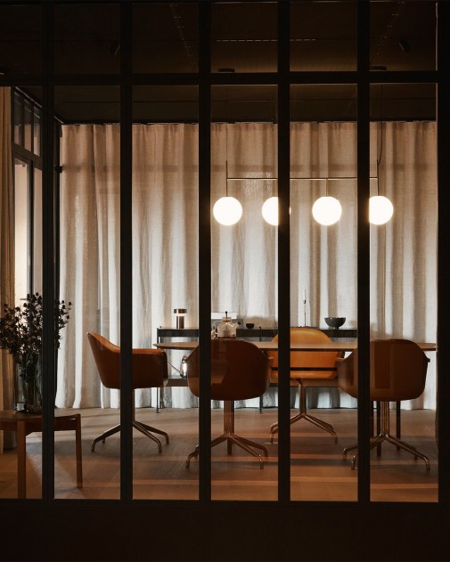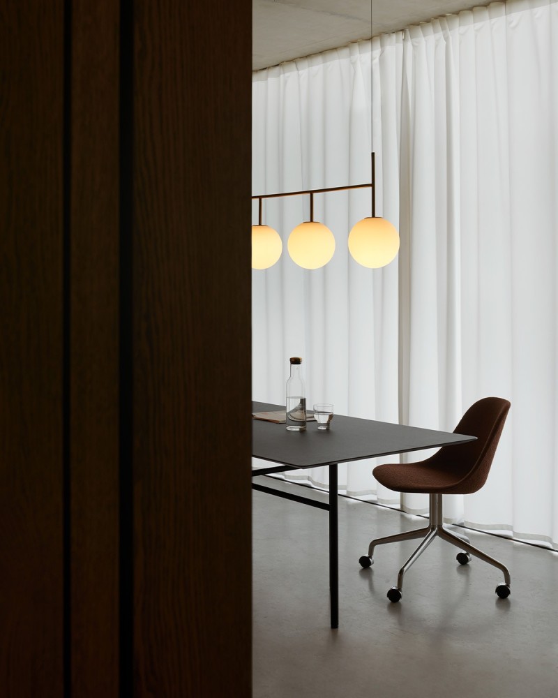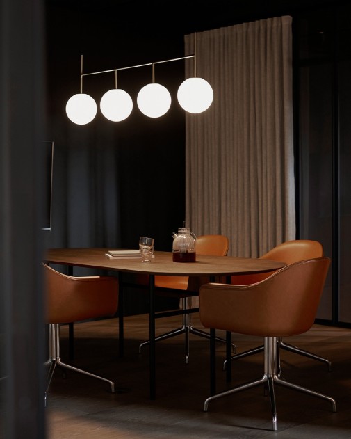 W wersji Suspension Frame cztery źródła światła zostały osadzone w linearnej, stalowej konstrukcji, tworząc wyrazistą, graficzną kompozycję. Kontrast między prostymi liniami ramy a miękką formą kulistych kloszy nadaje lampie nowoczesny, architektoniczny charakter.