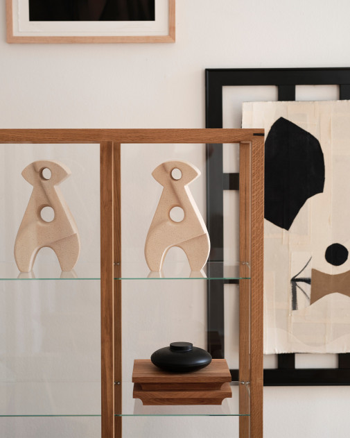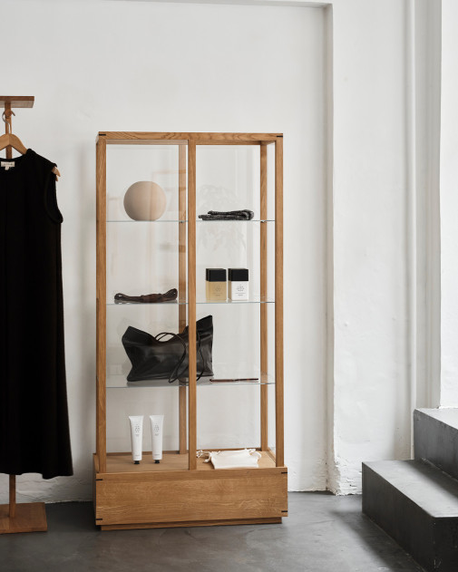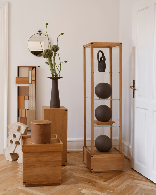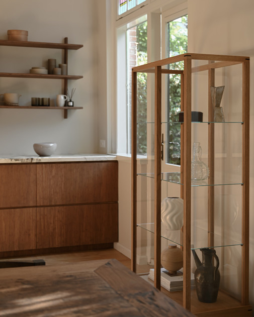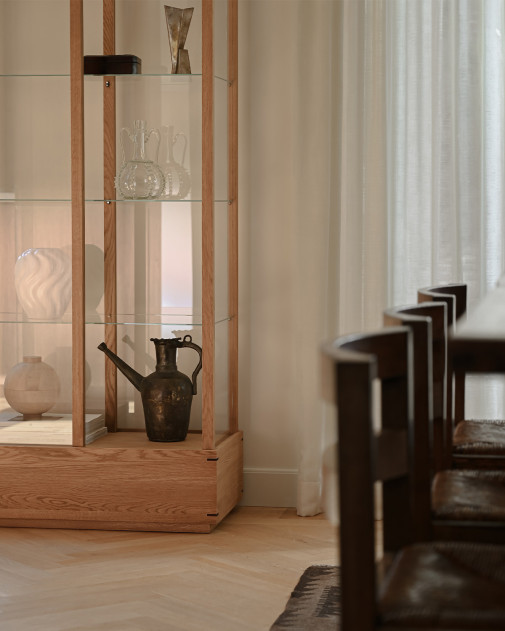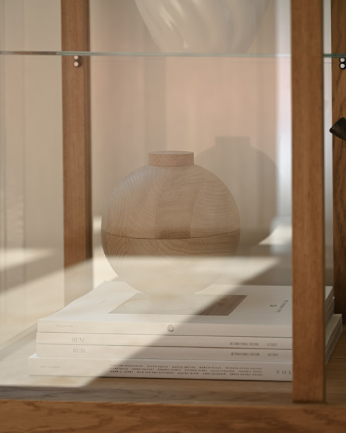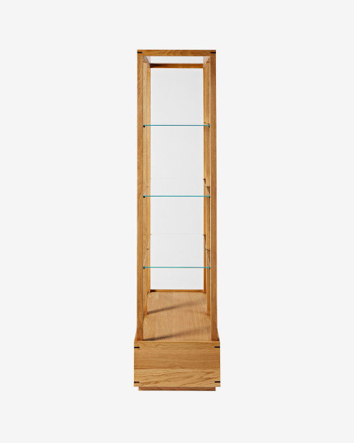 Korpus wykonany z ciepłego, olejowanego dębu zestawiono z hartowanym szkłem, co nadaje meblowi zarówno solidności, jak i wizualnej lekkości. Otwarty front oraz lewy bok zapewniają swobodę aranżacyjną i pozwalają eksponować ceramikę, książki, obiekty artystyczne czy kolekcjonerskie przedmioty w sposób niemal galeryjny. Japanese Vitrine L to mebel, który nie dominuje przestrzeni, lecz subtelnie ją porządkuje i podkreśla charakter wnętrza.
