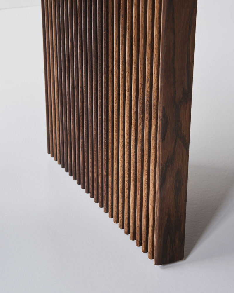 Lite drewno, z którego został wykonany, zapewnia niepowtarzalny wygląd – każde usłojenie czyni go unikalnym dziełem natury. Blat o delikatnie zaokrąglonych krawędziach wsparty jest na smukłych, ale solidnych nogach, które dodają mu lekkości i stabilności jednocześnie.