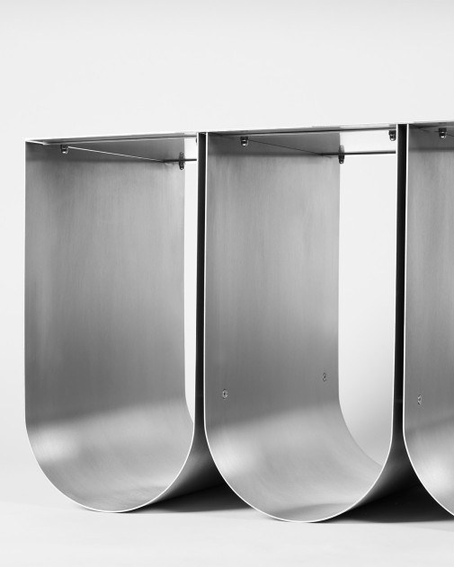 Rzeźbiarska ławka o wyrazistej, nowoczesnej formie, wykonana z malowanej proszkowo stali. Pięć zakrzywionych segmentów tworzy funkcjonalną podstawę z miejscem do przechowywania.