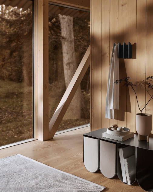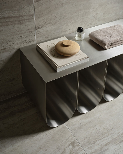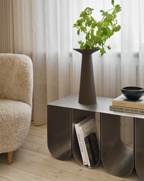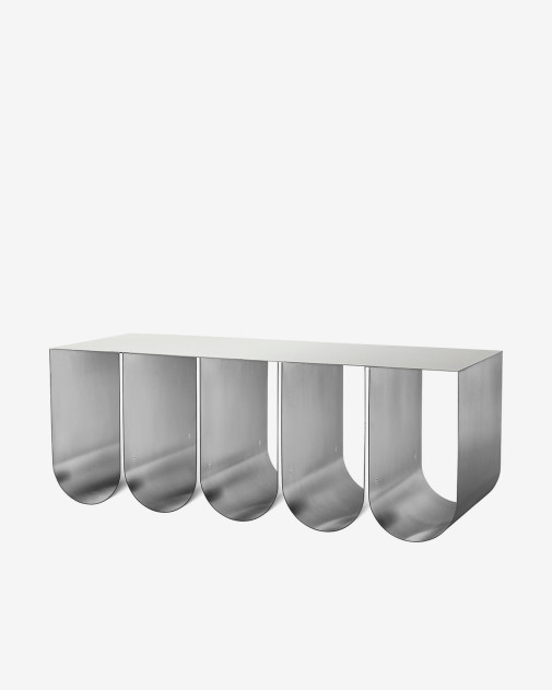 Konstrukcja wykonana jest z malowanej proszkowo stali w beżowym odcieniu. Zakrzywione przegrody nie tylko definiują estetykę mebla, ale również pełnią funkcję praktyczną, oferując miejsce do przechowywania książek lub magazynów. Ławkę można uzupełnić o dedykowane Curved Boxes (sprzedawane oddzielnie), uzyskując bardziej uporządkowany, spójny wizualnie efekt. Curved Bench doskonale sprawdzi się w przedpokoju, salonie lub przestrzeniach komercyjnych jako element użytkowy i dekoracyjny jednocześnie.