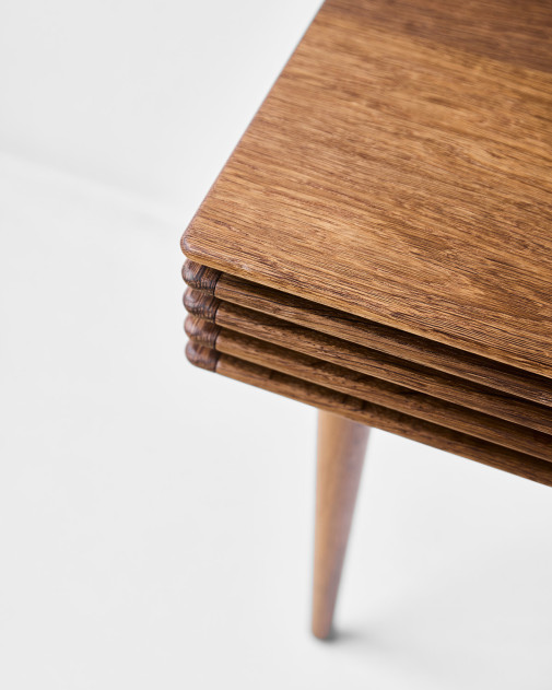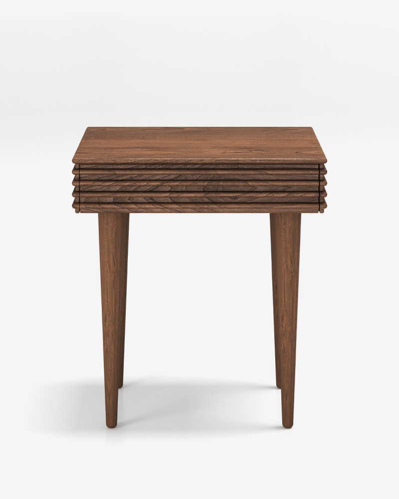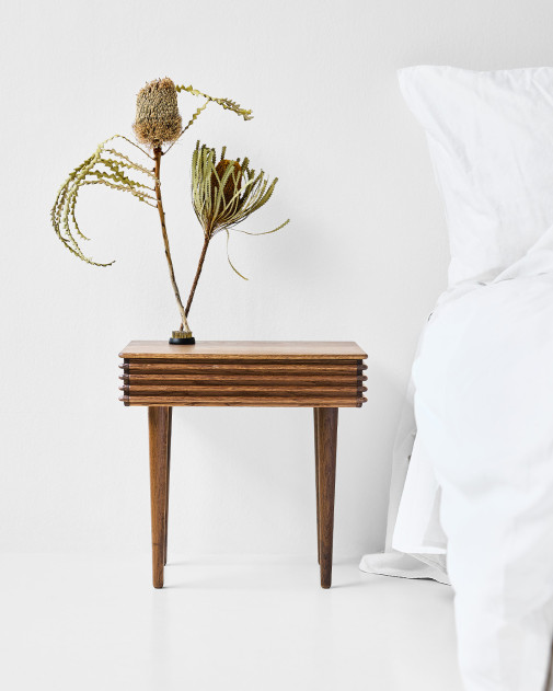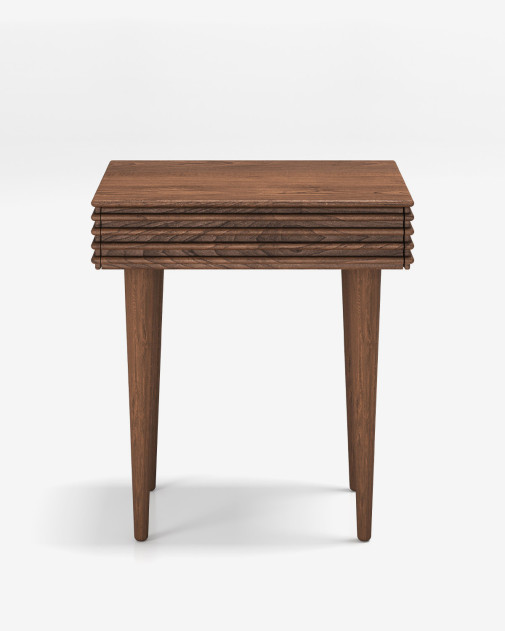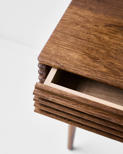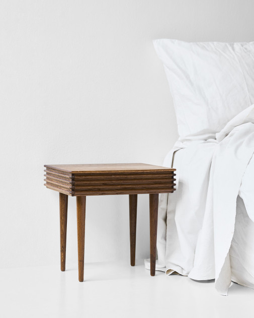 GROOVE NIGHT TABLE to wyjątkowy stolik nocny wykonany z litego drewna, wyróżniający się ręcznie rzeźbioną powierzchnią blatu. Dzięki eleganckiej i minimalistycznej formie doskonale komponuje się w nowoczesnych i klasycznych wnętrzach, stanowiąc zarówno funkcjonalny, jak i dekoracyjny element sypialni.