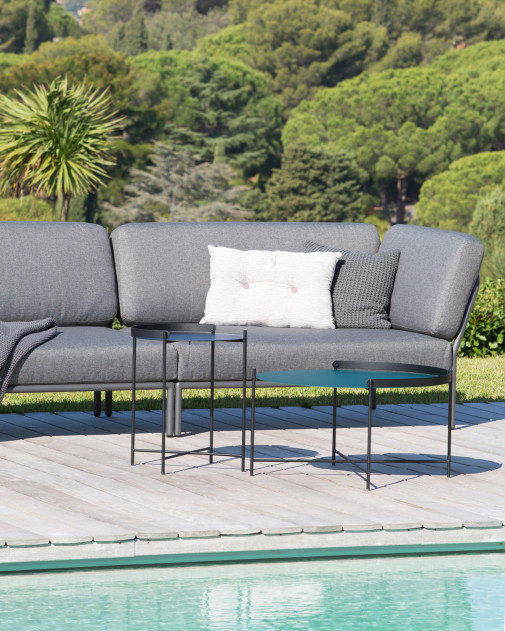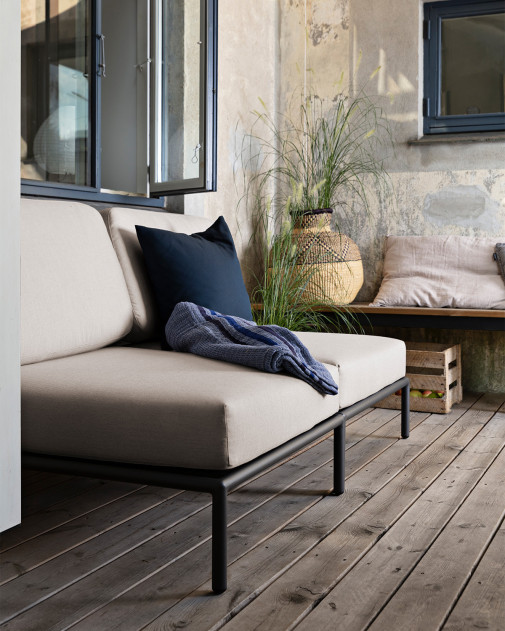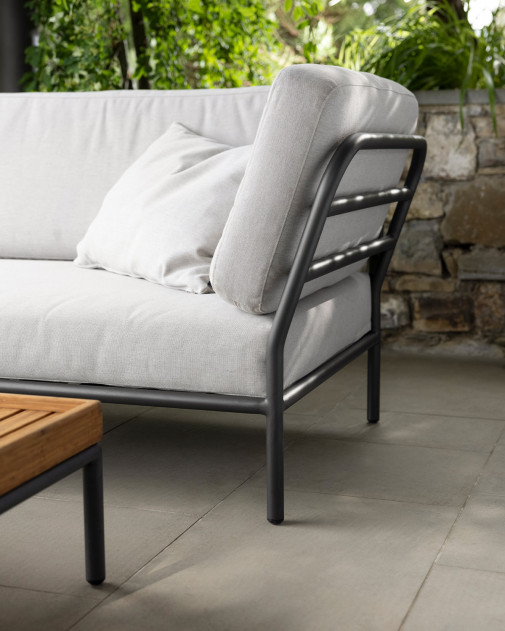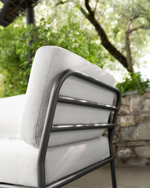 Niska, stabilna forma sprzyja relaksowi i pozwala na swobodne dopasowanie pozycji ciała. Miękka poduszka wykonana z tkaniny outdoorowej zapewnia wysoki komfort użytkowania, a jednocześnie zachowuje odporność na warunki atmosferyczne. Aluminiowa rama nadaje całości nowoczesny, lekki charakter i gwarantuje trwałość w codziennym użytkowaniu na zewnątrz.